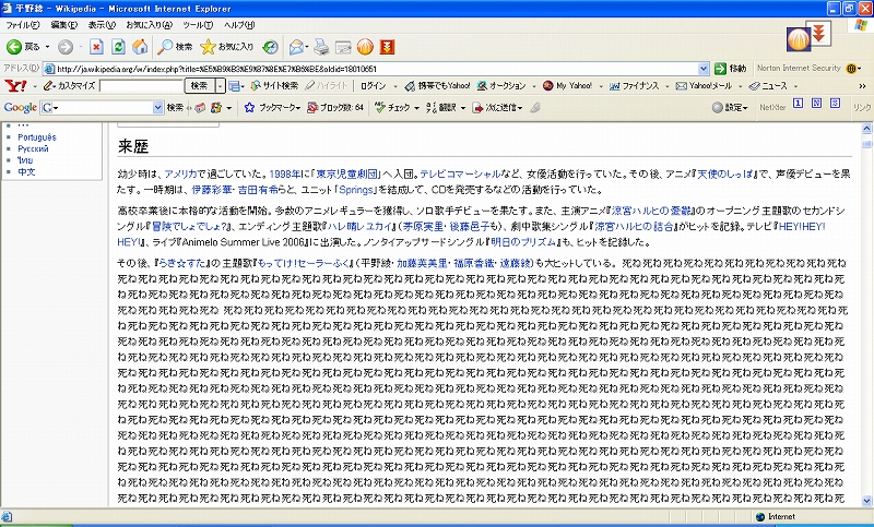 事件が起きると「荒れる」ことも多いウェブ上の百科事典「ウィキペディア(Wikipedia)」だが、人気アニメ「涼宮ハルヒの憂鬱」の主演声優の項目が荒らされた。項目が「死ね」という言葉で埋め尽くされるという異常な荒らされ方で、ネット上は「これはひとい」「こわい」と言った声が相次いでいる。(J-CAST)